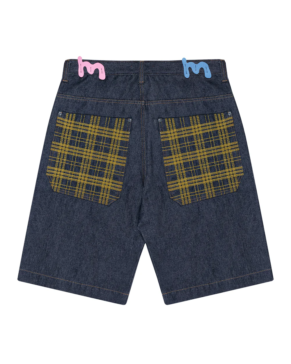 Bermuda Jeans é confeccionada em tecido 100% algodão, modelagem oversized, com dois bolsos frontais e dois bolsos traseiros bordados com padrão xadrez.