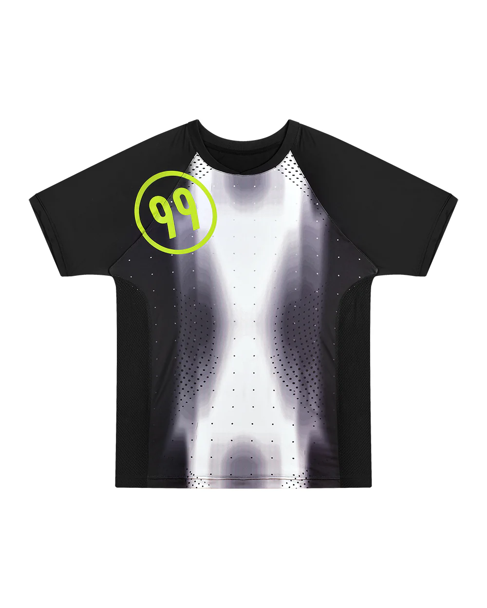 Nessa Jersey modelo Slim Fit referenciamos os designs clássicos da 'Total90', marcados por gradientes e padrões digitais que são pertinentes até os tempos atuais e moldaram a estética de peças esportivas.