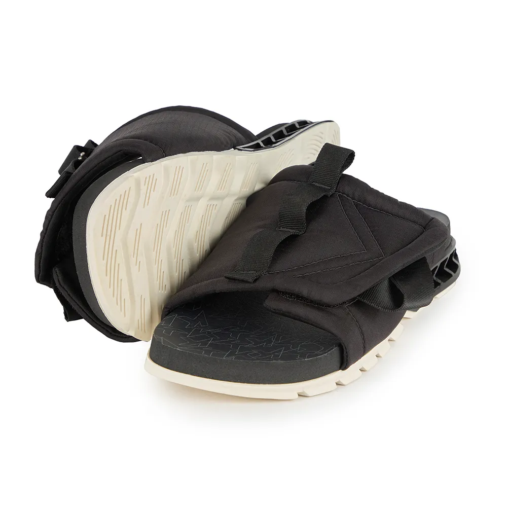 | Cabedal slide em tecido ripstop acolchoado com forro de neoprene na cor preta e pesponto contrastante inspirado no “K” de Kenner e puxadores na cor preta em tiras tramadas em nylon |